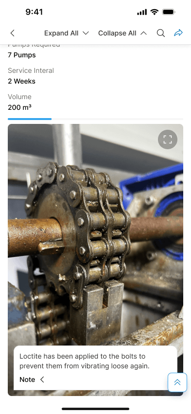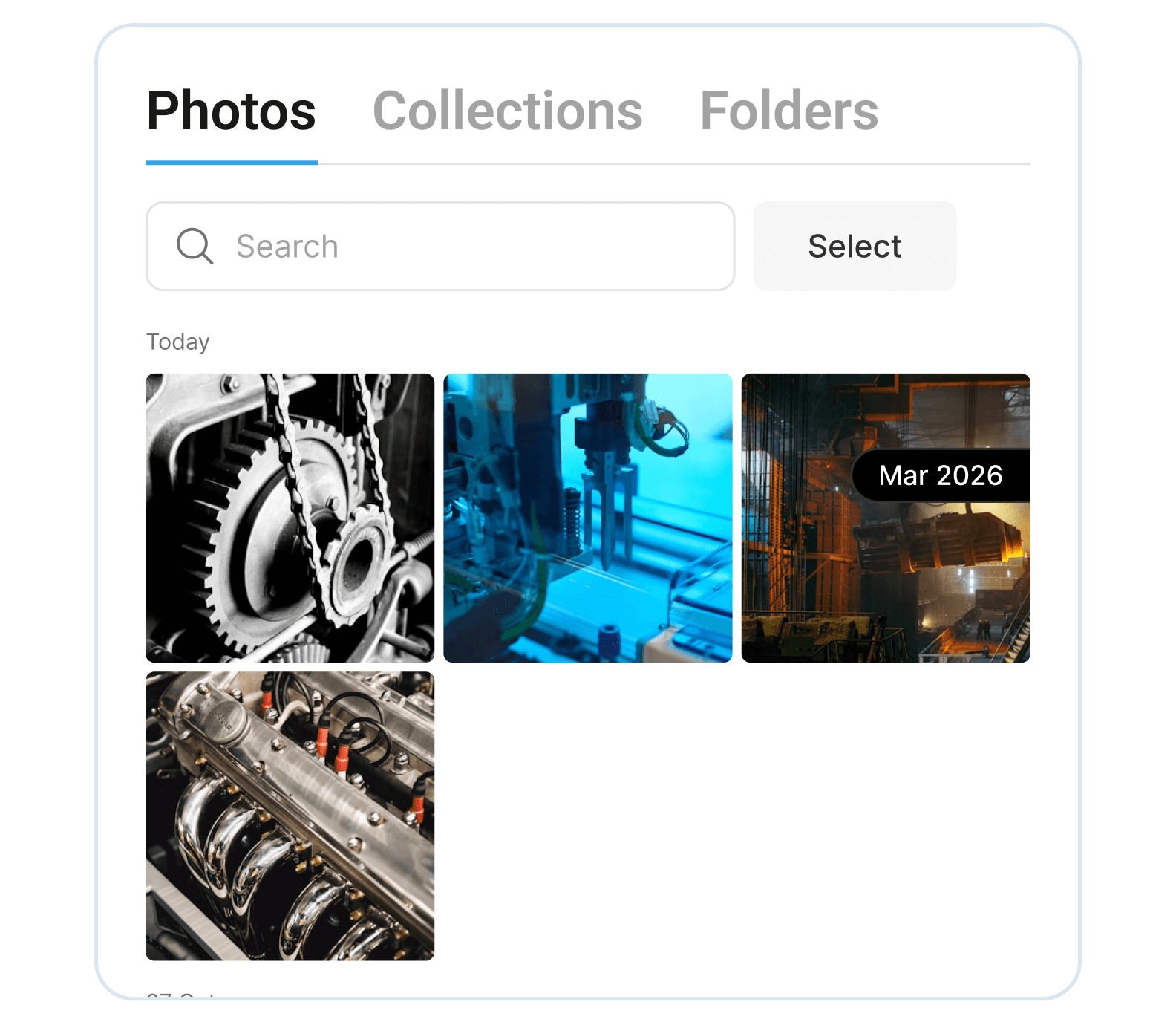 Organise site photos by job, equipment, or component. Add notes and context to every image