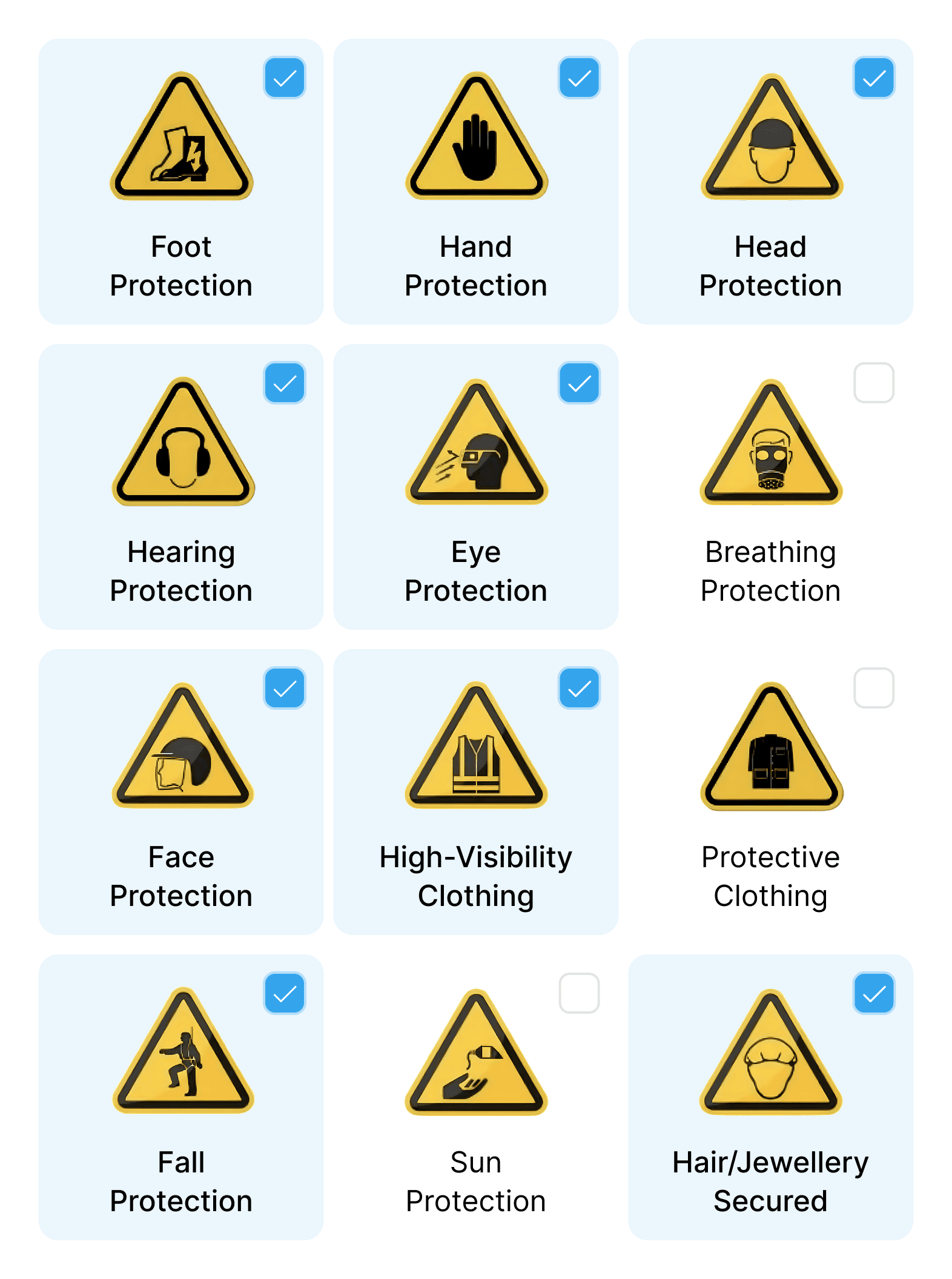 This helps ensure critical safety requirements such as fall protection, hearing protection, or respiratory equipment are clearly highlighted before work begins. Teams can easily adjust these selections to match the real conditions on the factory floor or maintenance area.