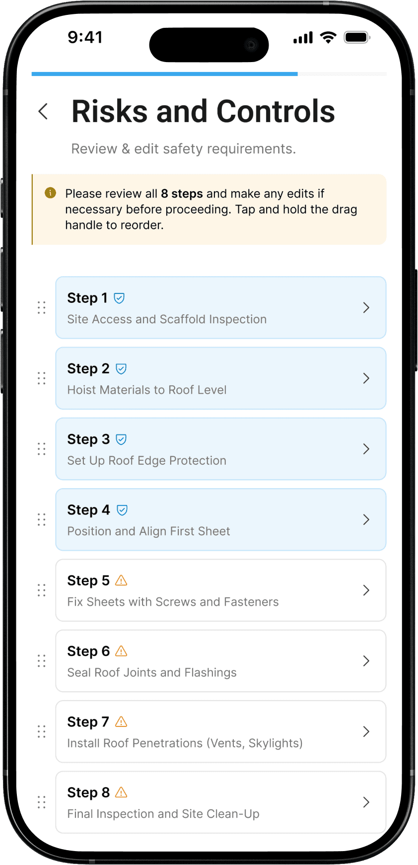 Each step of the job is automatically populated with associated hazards, risk levels, and recommended control measures. This ensures the SWMS is grounded in established safety practices while still allowing full flexibility.